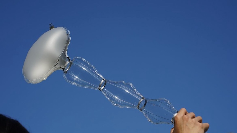 “不同于建筑界大多采用的固体支撑和传统导线结构,我们这次的产品选择了气体支撑的结构,赋予了设计轻盈感与未来感。”说话间,钱畅展示了这款灯的更多“惊喜点”:随着掰动,使用可回收TPU材质的灯柱呈现出各式各样的造型;摆动气囊的存在让灯光可以自由调节,在任意角度悬停;通过泄气压缩的方式,压力气泡灯还可以压扁折叠到非常小的体积,实现轻便的储存和运输,这也让灯的适用场景得到了最大可能的开发。