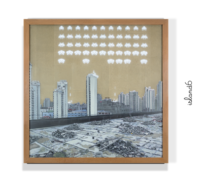 Material: RGB LED display, acrylic painting on Plexiglas, paper collage, teakwood frame